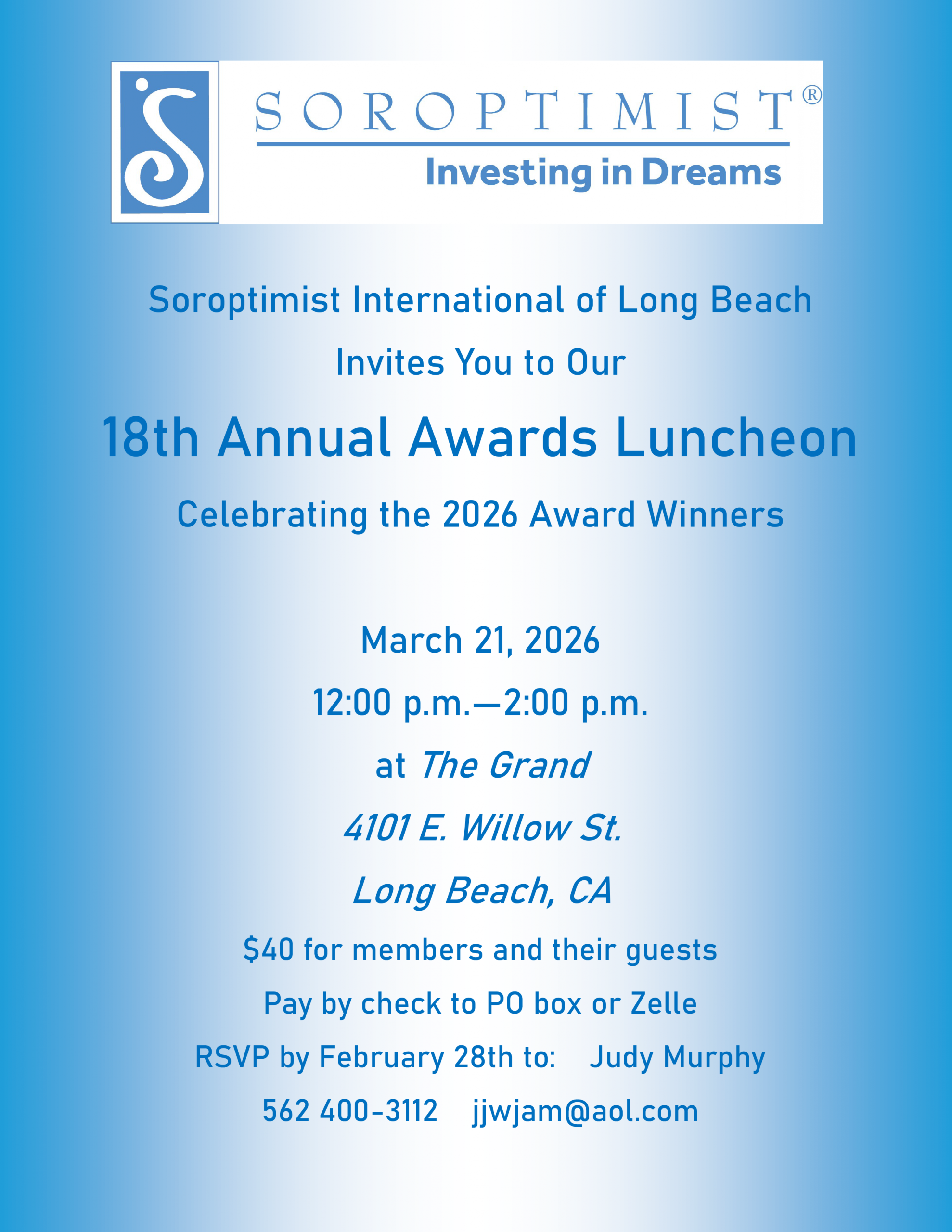 Soroptimist is a volunteer service organization for professional women who work to improve the lives of women and girls in local communities and throughout the world. The Long Beach club is a part of Soroptimist International of the Americas which has more than 1,300 clubs in 130 countries and territories. Soroptimist clubs receive assistance in their volunteer efforts by participating locally in programs developed and sponsored by the organization. The Long Beach club is in the Camino Real Region.